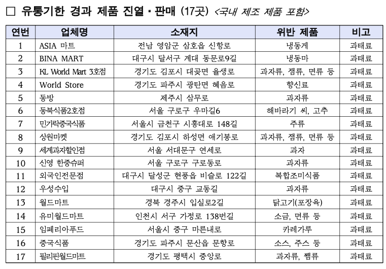 ○ 주요 위반 내용은 ▲과자류 등 무신고(무 표시) 식품 판매(14곳) ▲유통기한 경과 제품 판매(17곳)이며, 불법 돈육가공품(소시지 등) 판매 위반행위는 없었습니다.