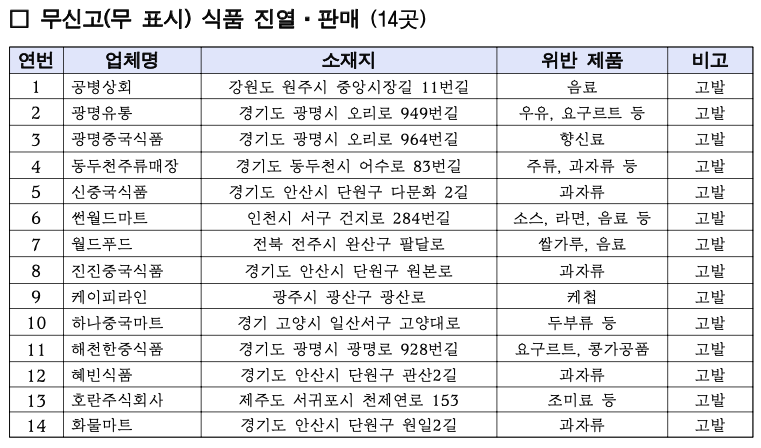 * 무신고 제품 판매(고발) // 유통기한 경과 제품 판매(과태료 부과) [첨부]