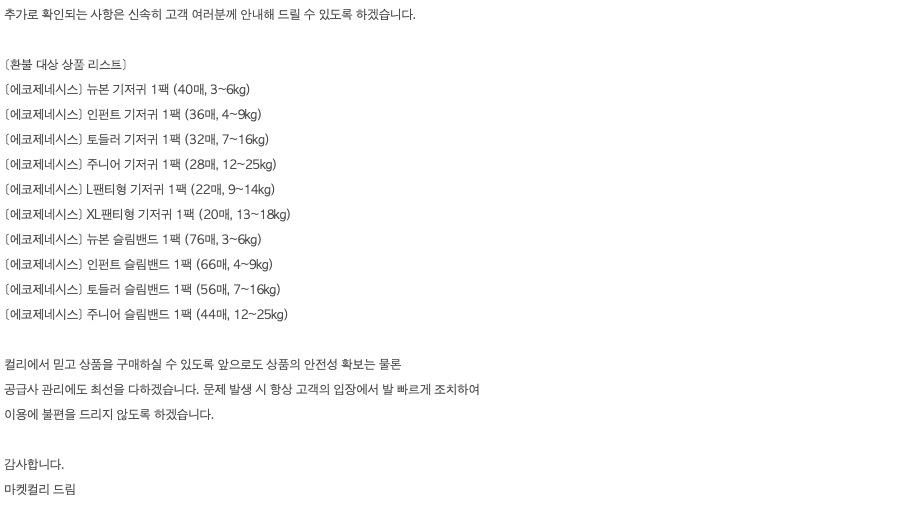 결국 보도가 되자 마켓컬리에선 해당 기저귀를 판매중단 했습니다. 취재가 시작되자 그제서야 사과문을 게재하고 전액환불을 결정했다는데... 과연 전액환불이 될지는 개인적으론 의문입니다.