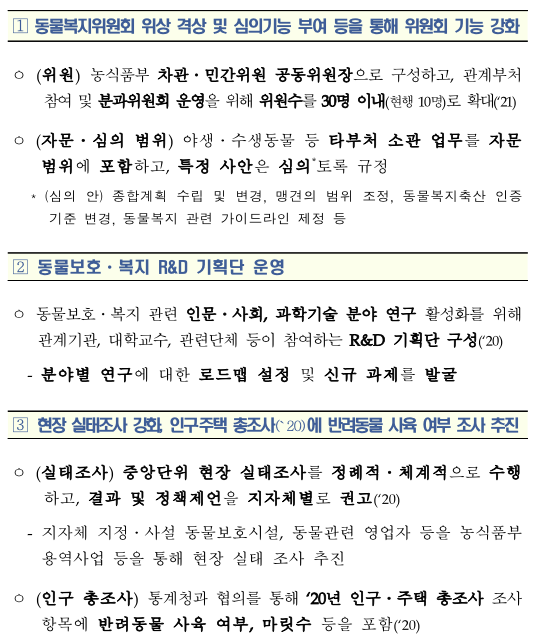 ① (동물보호ㆍ복지 인식 개선) 소유자 준수사항 강화, 동물학대 유형별 처벌 차등화, 동물보호ㆍ복지 교육 활성화, 동물등록제 개선