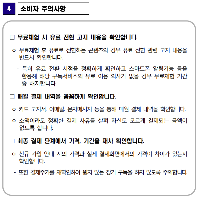 한국 소비자원은 1달 무료구독 뒤 자동결제를 전환시키면서 소비자로 하여금 전환 사실을 미리 고지하지 않거나 해지하더라도 까다롭게 만들어 해지를 어렵게 만드는 사례가 많아져 주의를 하라는 보도자료를 냈습니다.