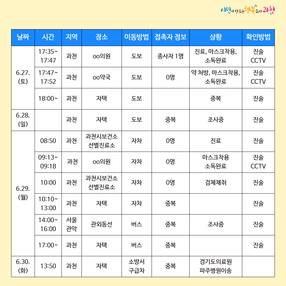 5월28일(목) 자택 ⇒ 7:40 자전거 ⇒ 8:10 학교 ⇒ 자전거 ⇒ 16:55 00아카데미(접촉자 파악 완료, 소독조치 완료) ⇒ 자전거 ⇒ 20:50 친구집 ⇒ 아버님차 ⇒ 21:30 자택