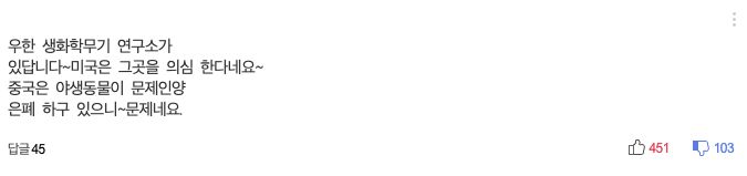다만 이런 사실에 대해 연구소의 이름만 바꿔 생화학무기 연구소라는 이름으로 유언비어가 퍼지고 있는 것 같습니다..