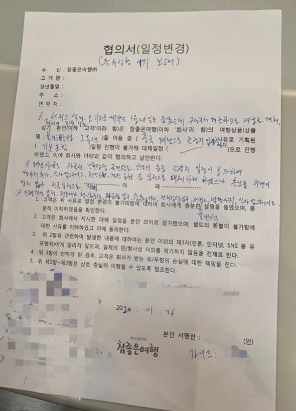 부실한 여행 일정에 화가 나 있던 여행객들은 중국 공항에서 또 한 번 분통을 터뜨렸다. 비행기 탑승 10여분 전 가이드가 갑자기 ‘서명’을 해달라며 종이 한 장을 내밀길래 봤더니, 그 내용이 상당히 황당했다. 각서 형식의 협의서엔 ‘일정 변경에 대해 회사로부터 충분한 설명을 들었고 대체 일정은 본인 의지로 참가했으니 별도의 환불은 어렵고, 만약 이를 언론 등에 알릴 경우 회사 손실에 대해 책임을 묻겠다’는 내용이 담겨 있었다. 당시엔 비행기 시간 때문에 경황이 없어 일단 서명했다.