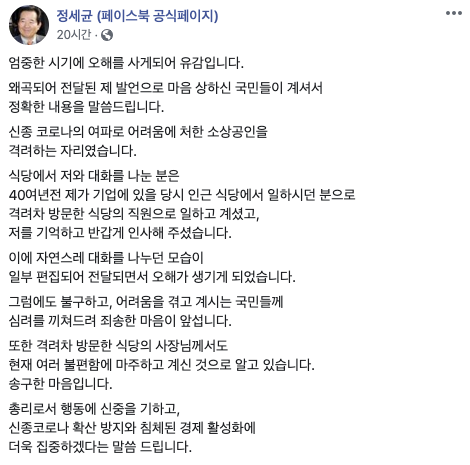 하지만 정세균 총리가 들른 상가는 2군데이고.. 각자 논란이 된 발언을 한 만큼 식당은 좋게 받아들였다 하더라도 다른 상가와 그 모습을 방송으로 본 상인들은 다르게 받아들일 수 있는 여지도 있습니다.. 따라서 해명은 하더라도 논란이 된 것에 대해 유감을 표명하는게 좋다고 생각합니다.. 아무래도 국무총리 신분으로 발언한건 무게감이 다르니까요..