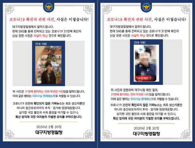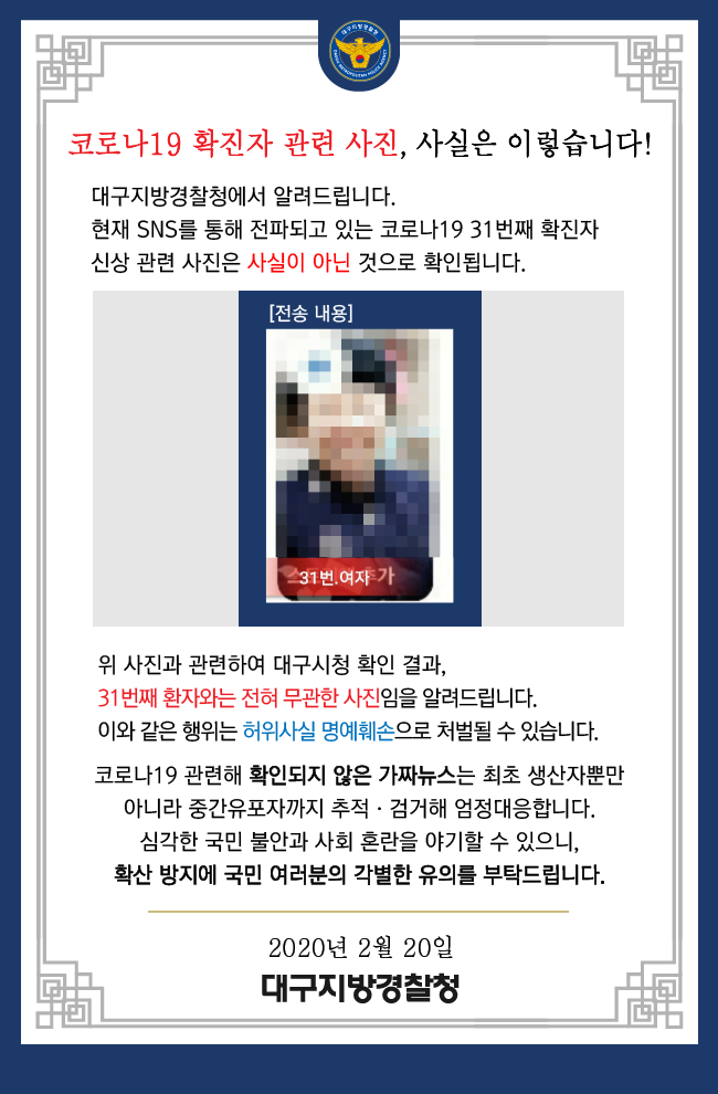 대구경찰청은 20일 페이스북을 통해 “현재 SNS(사회관계망서비스)를 통해 전파되고 있는 코로나19 31번째 확진자 신상 관련 사진은 사실이 아닌 것으로 확인된다”고 밝혔다.