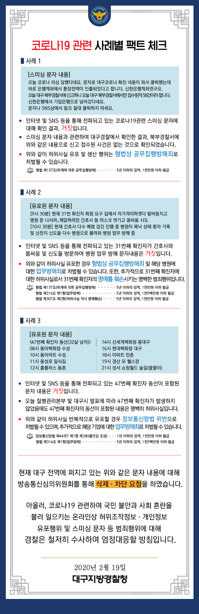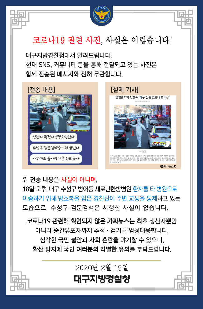 대구경찰청은 “이와 같은 행위는 허위사실 명예훼손으로 처벌될 수 있다”며 “코로나19와 관련해 확인되지 않은 가짜뉴스는 최초 생산자뿐 아니라 중간 유포자까지 추적·검거해 엄정 대응한다”고 밝혔다.