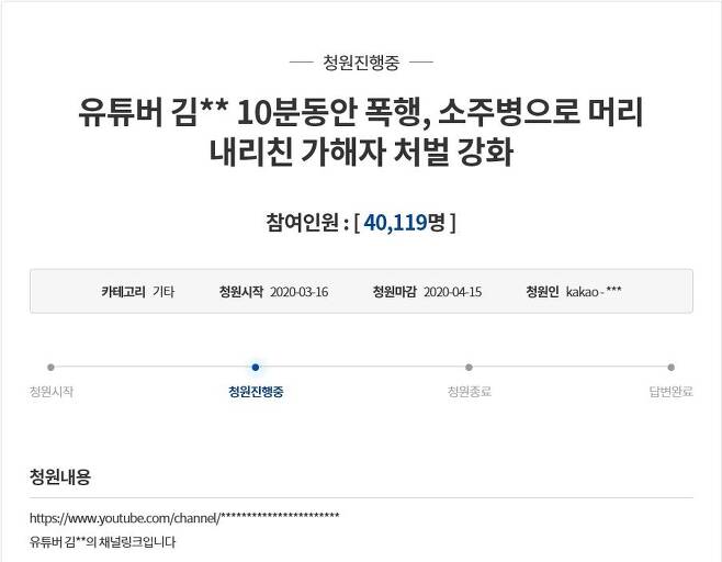 영상이 공개되자 청와대 국민청원 게시판에 '유튜버 김** 10분동안 폭행, 소주병으로 머리 내리친 가해자 처벌 강화'라는 제목의 청원 글이 올라왔고, 이날 오전 8시 현재 4만여명이 청원에 동의했다.