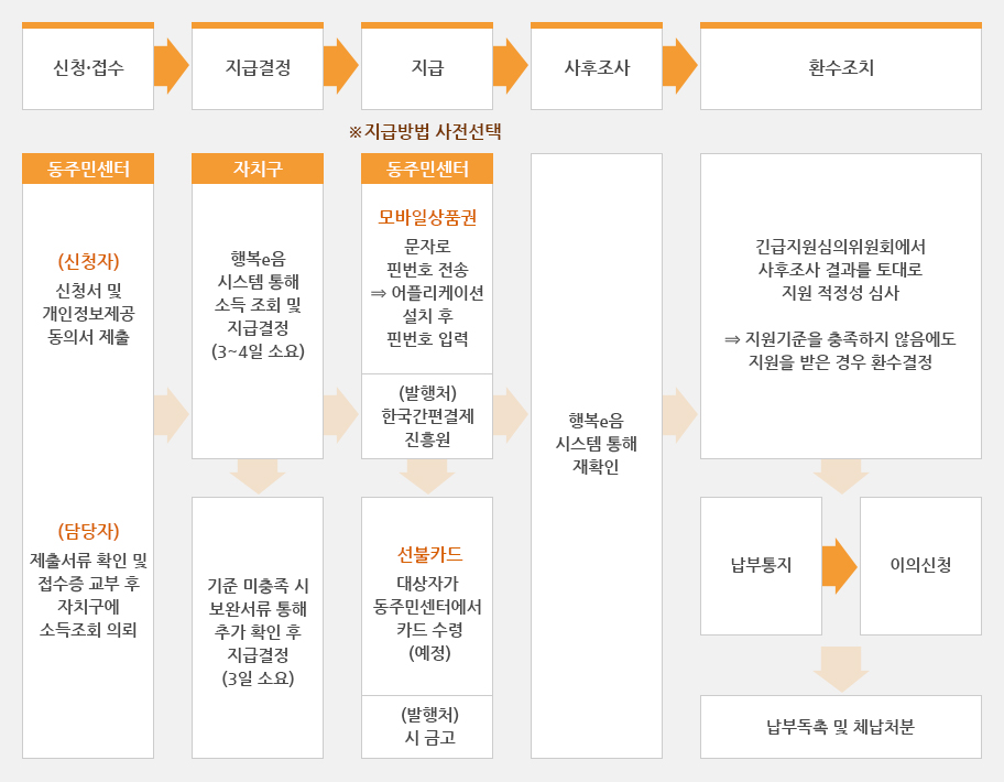 지급 절차는 최대한 간소화했다. 거주하는 읍면동 행정복지센터에서 신원 확인만 하면 가구원 모두를 대리해(성년인 경우 위임장 작성 필요) 전액을 신청 즉시 수령할 수 있다.