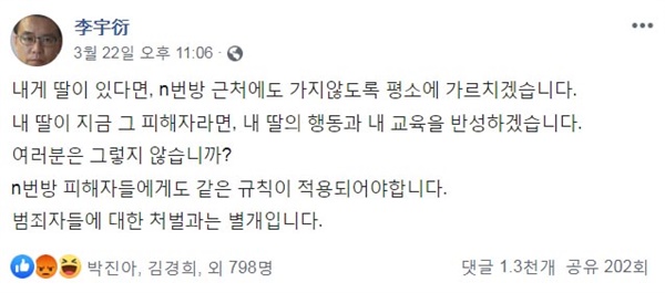 "내게 딸이 있다면, n번방 근처에도 가지 않도록 평소에 가르치겠습니다. 내 딸이 지금 그 피해자라면, 내 딸의 행동과 내 교육을 반성하겠습니다. 여러분은 그렇지 않습니까? n번방 피해자들에게도 같은 규칙이 적용되어야 합니다. 범죄자들에 대한 처벌과는 별개입니다."