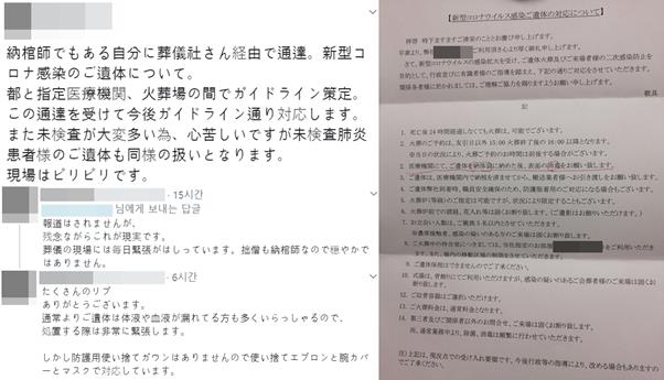 시신을 염하는 일을 한다고 자신을 소개한 한 일본 누리꾼은 15일 자신의 사회관계망서비스(SNS)에 ‘신종 코로나바이러스 감염 시신의 대응에 대해’라는 제목의 문건을 올렸다. 이는 코로나19 감염 확대에 따라 각 도의 지정 의료기관과 화장터 간의 시신 처리 절차를 규정한 정부 지침에 따른 것이다.