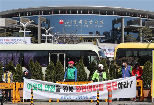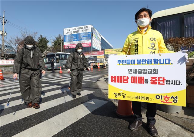 정의당 구로구갑 이호성 후보는 이 교회 앞에서 ‘주민들이 불안해하니 예배당 예배를 중단하자’라고 적힌 팻말을 들고 1인 시위를 했다. 4주째 시위에 나섰다는 이 후보는 “연세중앙교회는 전국에서 사람들이 몰려드는 교회라 주민들이 더 불안해한다. 교회가 공적 책임을 다해야 한다고 생각한다”고 말했다.