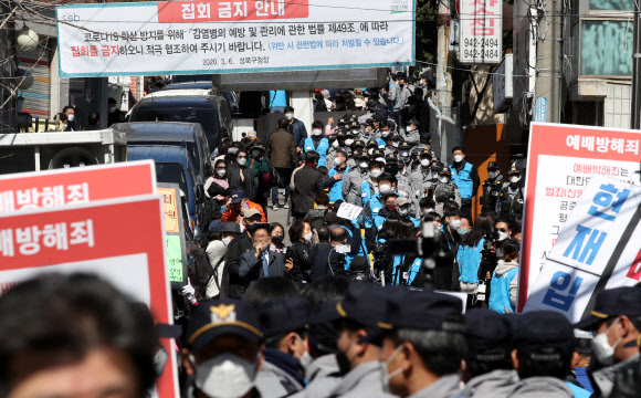 그런데도 현장 예배를 강행한 이 교회에는 이날도 오전 9시쯤부터 신도들이 하나둘 모여들기 시작했다. 현장에는 서울시와 성북구청 직원 110여명, 경찰 400여명이 출동했지만 교회 출입을 완전히 막지는 않았다.