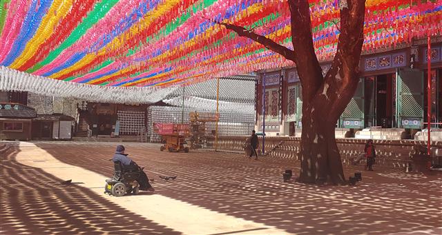역시 다음 달 5일까지 법회를 취소한 서울 종로구 조계사도 한산한 모습이었다. 입구에서 체온을 재고 방명록을 작성한 뒤 손을 소독하고 들어온 일부만 대웅전에 앉아 예불했다.