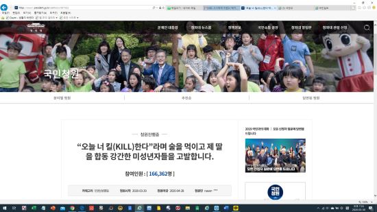 “오늘 너 킬(KILL) 한다”라며 술을 먹이고 제 딸을 합동 강간한 미성년자들을 고발합니다”라는 제목의 청와대 청원은 30일 게시됐다.