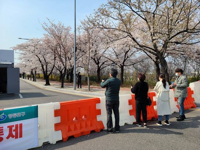 배우자와 함께 이곳을 찾은 김모씨(62)는 "벚꽃길 폐쇄한 건 알고 있었지만 올해 꽃은 어떻게 생겼나 구경도 할 겸 찾았다"면서 "거리두기 자체는 반대하지 않는데 답답하고 지루해 나왔다"고 밝혔다. 그는 아쉬운 마음에 바리케이드 앞에서 사진을 찍고 여의도 한강공원 쪽으로 발길을 돌렸다.