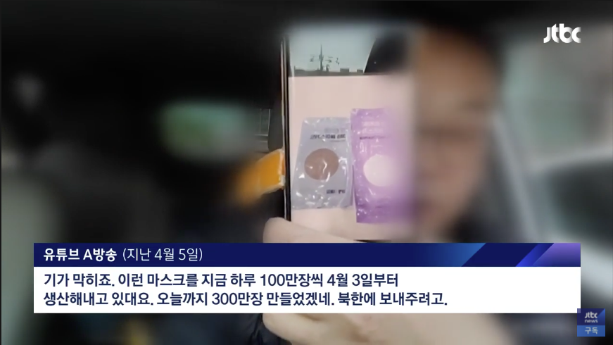 [유튜브 A방송 (지난 4월 5일) : 기가 막히죠. 이런 마스크를 지금 하루 100만장씩 4월 3일부터 생산해내고 있대요. 오늘까지 300만장 만들었겠네. 북한에 보내주려고. 참 기가 막히죠. 보랏빛의 이거는 45만장, 옆에 것은 55만장…]