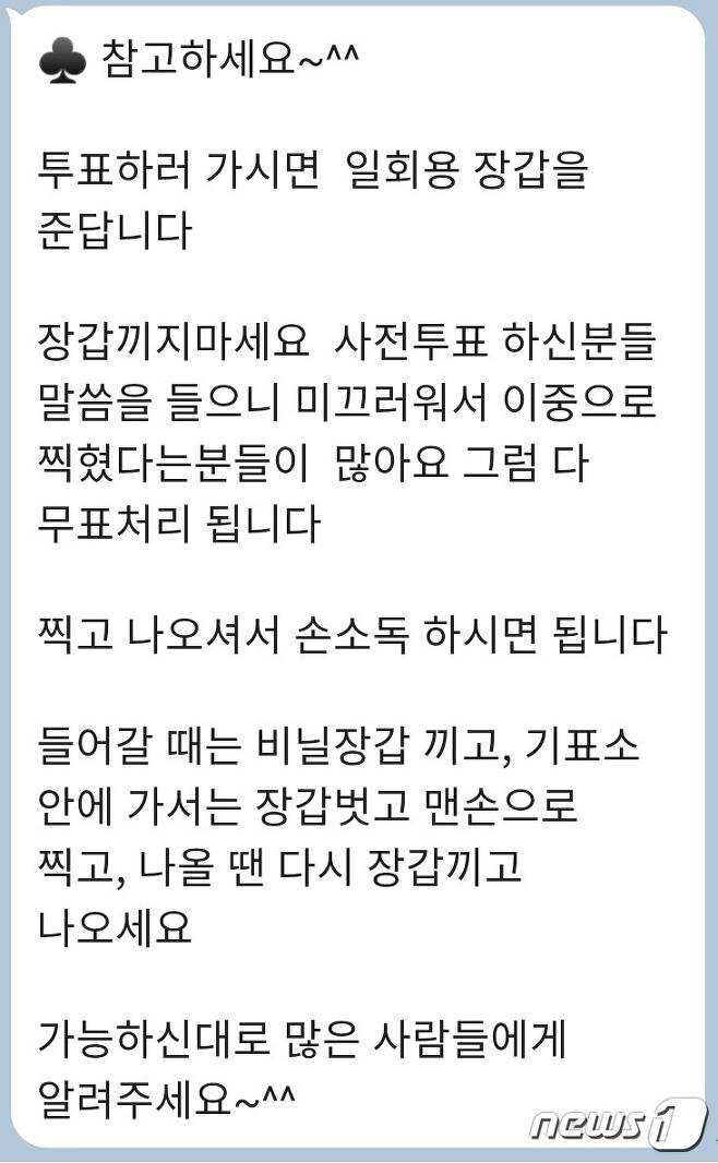14일 뉴스1 취재에 따르면 투표소에서 비닐 장갑을 착용하지 않도록 권장하는 내용의 메시지들이 최근 일부 카카오톡 단체 대화방을 중심으로 유포되고 있다.