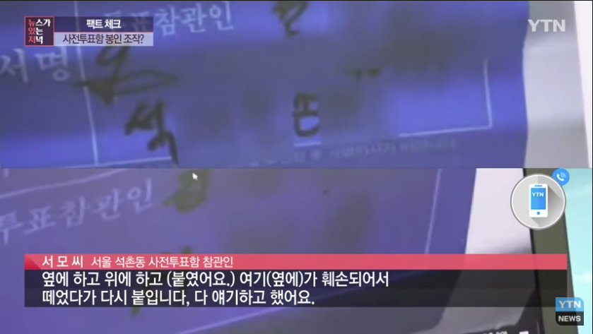 저희가 이것도 좀 의아했습니다. 그래서 참관인으로 참여를 했던 분이 있는데 정 모 씨라는 분이 있는데 이분이 투표 첫째 날하고 둘째날 모두 참여를 하셨습니다. 그리고 투표 종료 후 시작할 때 붙이신 게 아니고요. 끝나고 투표구 위쪽에 이틀 다 봉인지를 붙이고 서명을 했는데 2개 중에 하나가 본인 것이 아니라고 주장을 하는 겁니다.