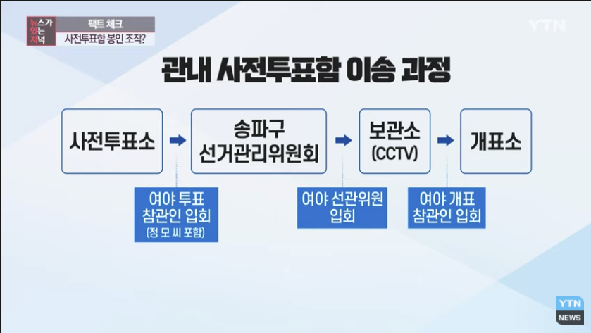 이 송파구 선거관리위원회에 접수된 이 사전투표함이 보관소로 들어가게 되는데 이 과정에 또 여야 정당에서 추천한 위원으로 이루어진 여야 선관위원들이 입회를 합니다. 여기서 또 보는 사람이 10명 정도 되는 겁니다. 이 과정에서 10명 정도가 지켜보고요.