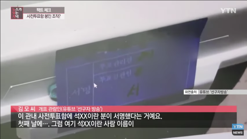 [김 모 씨 / 개표 관람인(유튜브 '선구자방송') : 이 관내 사전투표함에 석XX이란 분이 서명했다는 거예요. 첫째 날에…. 그럼 여기 석XX이란 사람 이름이 반드시 있어야 하는 거예요.그런데 없는 거예요.]