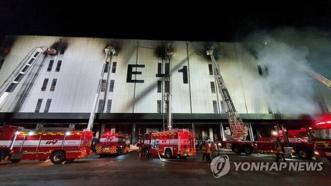 불은 전날 오전 10시 35분께 물류터미널 내 E동에서 발생했다. E동은 지상 5층(건축물 대장상 10층)에 연면적 3만 8936여㎡ 규모 철골조 건물이다.