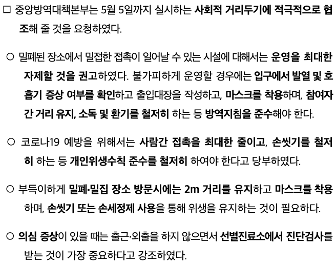 또한 “숙박시설 관리자들은 발열 체크, 손 소독제 비치, 거리두기 조치에 신경 써주시기를 바란다”며 “방역당국은 지자체와 협의해서 이동이 빈번히 일어나는 지역의 숙박시설과 식당, 많은 사람이 모이는 공간에 대한 방역 준비가 얼마나 잘 지켜지는지 관리를 강화하겠다”고 했다.