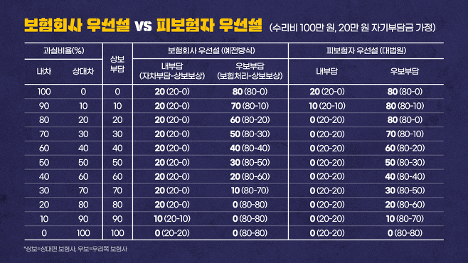 ※표 설명: 과실비율 내차 30%, 상대차 70%로 상대 보험사 70만 원 책임 가정, 보험회사 우선설에 따르면 이 돈 70만 원을 모두 내 보험사가 챙김. 이 경우 우리 쪽 과실 30만 원 중 나는 20만 원, 내 보험회사는 10만 원을 책임지게 되는 셈, 그러나 지금 법원은 피보험자 우선설에 따라 나한테 20만 원을 먼저 주고, 남은 50만 원만 내 보험회사에 줘야 한다고 판결. 이 경우 우리 쪽 과실 30만 원 중 나는 0원, 우리 보험회사는 30만 원(보험 처리한 수리비 80만 원-상대 보험사에서 받은 50만 원)을 책임지는 셈.