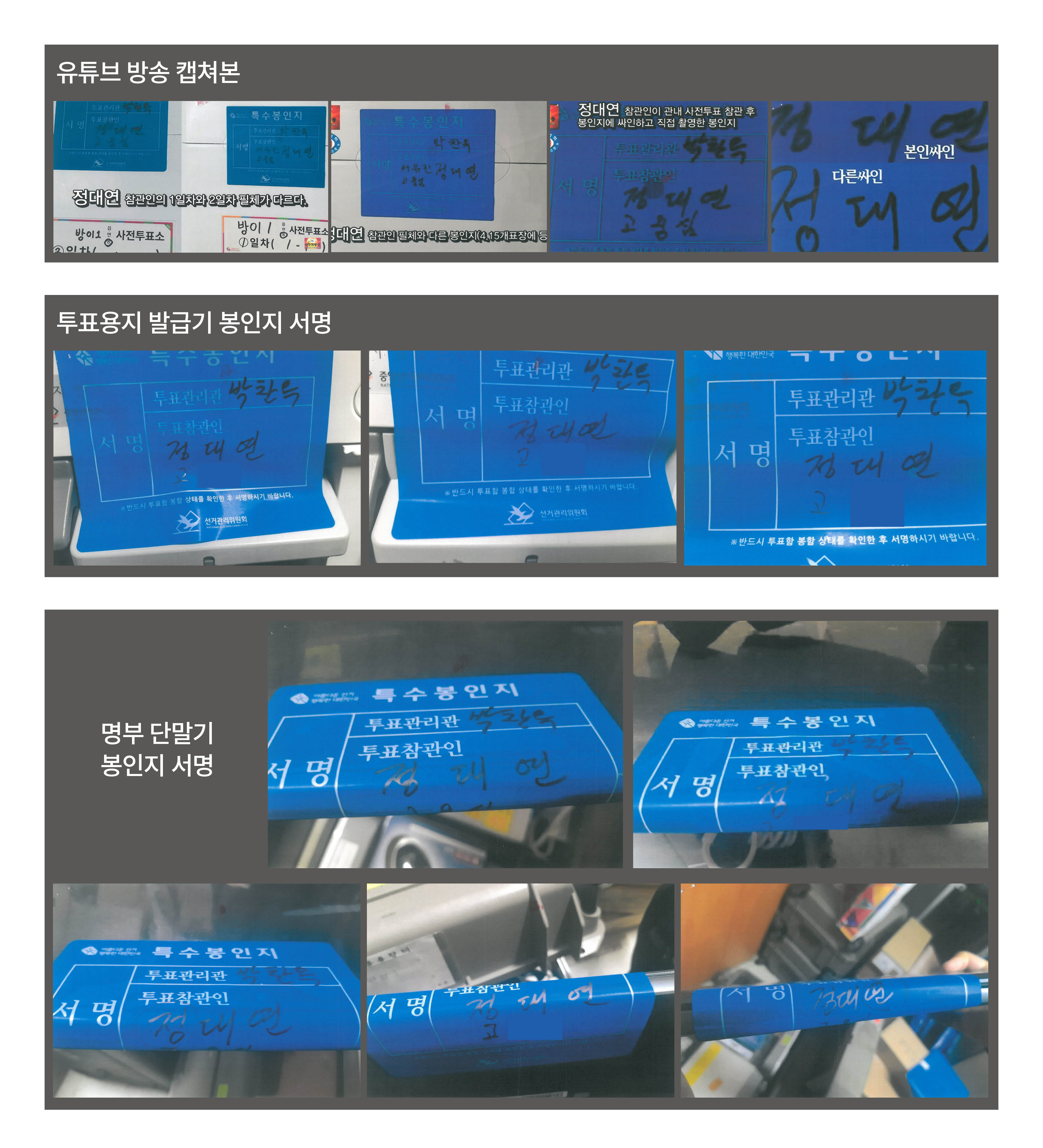 정씨는 본인의 필체가 아니라고 주장하나, 투표참관 당시 투표함 외에도 투표용지발급기 및 투표록 등에 서명한 기록이 있고, 여러 건의 서명을 확인·대조한 결과 두 장의 봉인지 서명 모두 정씨의 필체로 확인 및 증거사진 제시