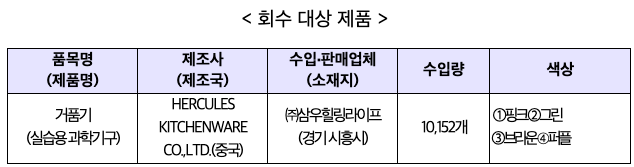 □ 식품의약품안전처(처장 이의경)는 수입식품등 수입‧판매업체인 ‘㈜삼우힐링라이프(경기 시흥시 소재)’가 중국산 거품기를 식약처에 수입신고하지 않고 통관한 후, 식품용도로 판매한 사실이 확인되어 해당 제품을 판매중단 및 회수 조치합니다.