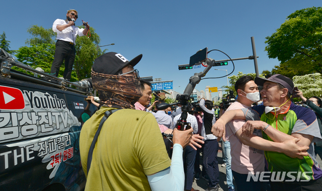 13분 동안 이어진 승강이는 유튜버가 탄 방송차가 5·18기념공원 반대 편으로 방향을 바꾼 뒤에야 일단락됐다.