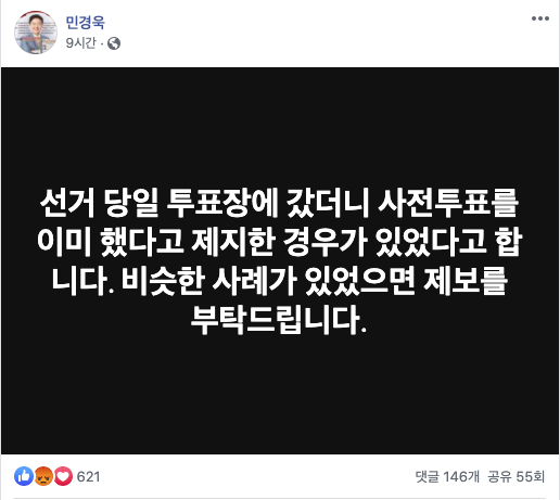 어찌되었든 민경욱의원이 제보를 받는다고 합니다. 비례대표 투표를 했는데 누군가 투표를 했다고 제지한 경우가 있다면서 유권자 신원을 도용해 사전투표를 했을 의혹을 언급했네요..