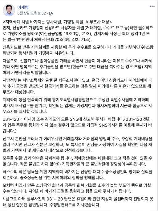 이 지사 및 경기도의 공식 페이스북 계정 등 SNS에는 지역화폐에 부가가치세를 덧씌우거나 아예 지역화폐를 받지 않는 차별 행위에 대한 신고가 이어지고 있다.
