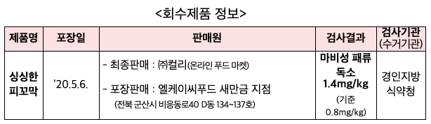 식약처가 패류독소가 기준치 이상으로 검출된 피꼬막 제품에 대해 회수조치를 하고 있다 합니다..