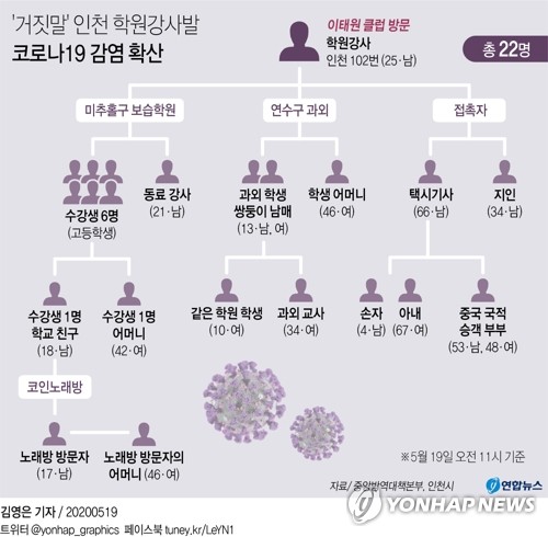 19일 인천시에 따르면 학원강사 A(25)씨와 관련된 확진자는 이날 5명이 추가돼 모두 22명이 됐다.
