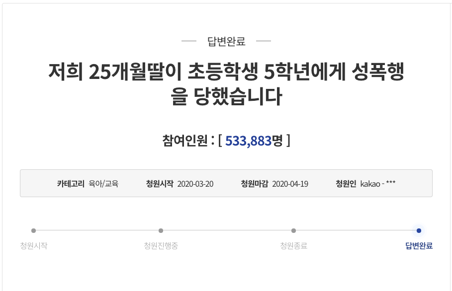 관련뉴스 : "25개월 딸이 초5에게 성추행당해"..청와대 국민청원 20만 동의