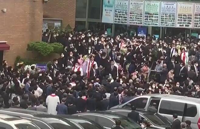 한 시민이 제공한 전날 오후 행사 당시 영상을 보면 교회건물 입구에 수백명이 몰려 있는 모습을 볼 수 있다. 참석자 중 일부는 마스크를 착용하지 않았다.