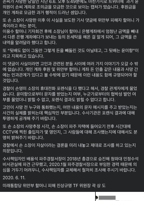 그는 구체적으로 손씨의 사망 당시 상황을 묘사하면서 '타살 가능성'을 제기했다. 또 개인계좌 후원 등과 사망 간 인과 관계가 있으니 규명해달라고도 요청했다.