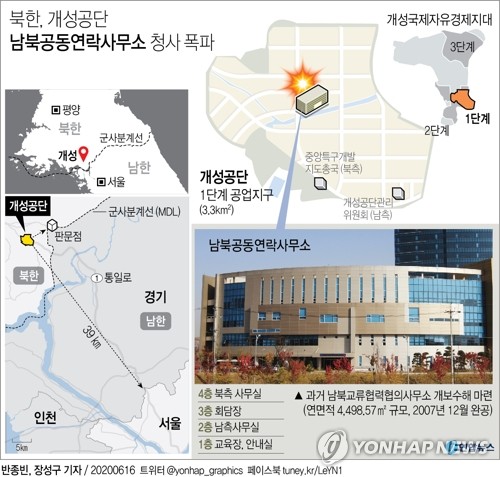 (서울=연합뉴스) 정빛나 배영경 기자 = 북한이 16일 오후 개성 남북공동연락사무소를 폭파했다.