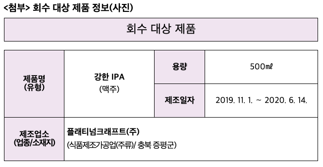 해당 제품은 플래티넘크래프트 맥주에서 만든 제품으로 제품명은 강한IPA입니다. 회수조치된 제품의 제조일자는 2019년 11월1일부터 2020년 6월 14일까지입니다..