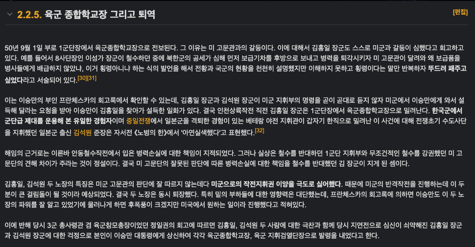 아마 이후 백선엽 전 장군에 대한 언급이 나온다면 상당수 김홍일 전 장군을 언급하며 반박하지 않을까 싶습니다.. 그 행적도 무시못할정도이고요..