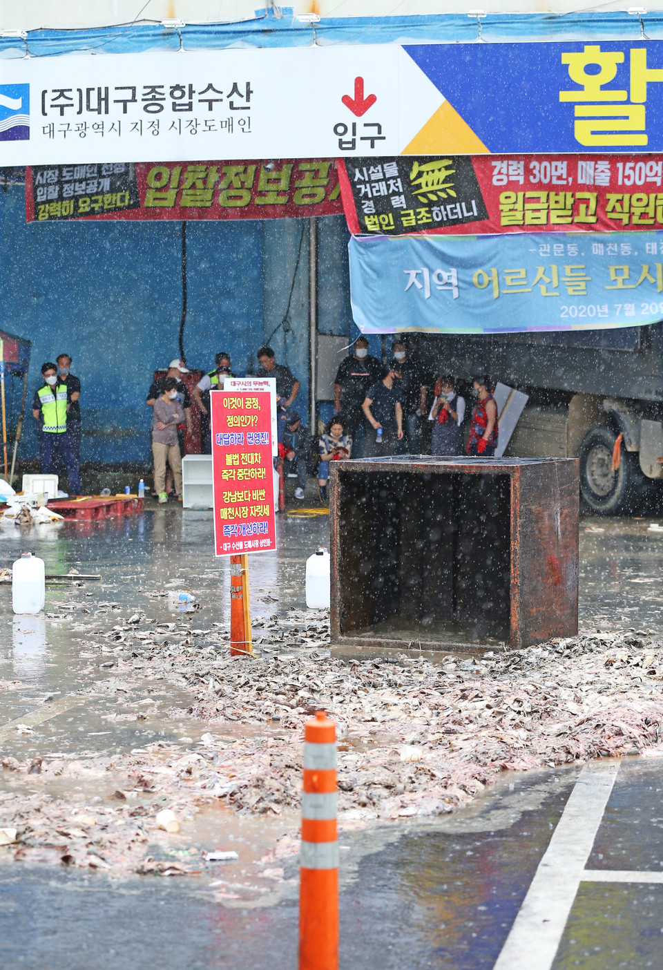 대구내에 있는 대구 북부농수산물도매시장이 논란이 되고 있습니다.. 이곳에서 대구시가 행정대집행에 들어갈려 할 때 상인들이 생선찌꺼기등을 쏟는 등의 방어행위를 하고 있기 때문입니다..