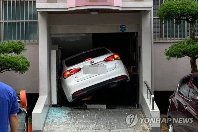 (광주=연합뉴스) 장아름 기자 = 21일 오전 7시 41분께 광주 북구 한 아파트에서 K3 승용차가 아파트 공동현관으로 돌진했다.