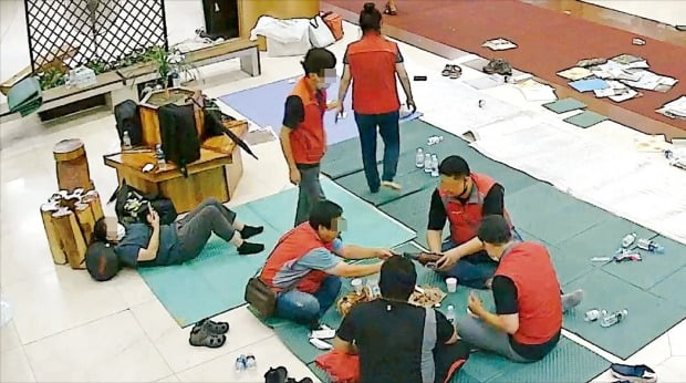 노조는 전날 밤 구청 로비에서 술판을 벌이기도 했다. 한국경제신문이 단독으로 입수한 노원구청 CCTV 영상에는 전날 밤 9시께 노조원들이 청사 1층 로비에 삼삼오오 모여 앉아 술잔을 기울이는 모습이 담겨 있었다. 노원구 관계자는 “청사를 불법 점거한 것도 모자라 술판을 벌이는 모습을 보고 어안이 벙벙했다”며 “노조가 집회를 시작한 지난달 말부터 노원구청의 업무는 사실상 마비된 상태”라고 토로했다.