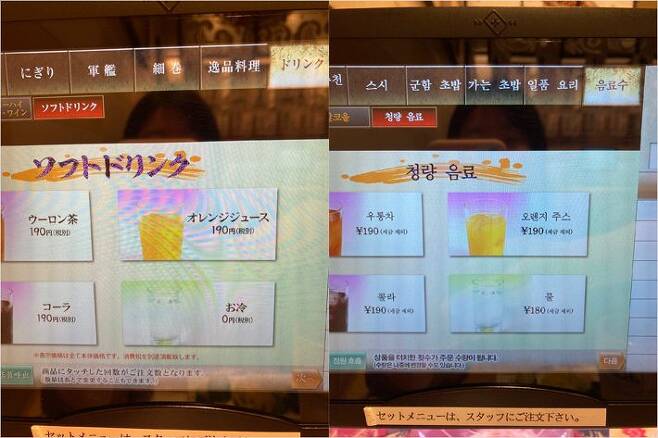 일본 내 회전초밥 체인 간코스시 신오사카역점에 방문한 재일 교포 A씨는 식사 마무리에 냉수를 주문하려다 황당한 경험을 했다. 메뉴주문 창 속 냉수에 180엔 가격이 붙어있던 것. 이상하게 생각한 그는 주문창을 다른 언어로 확인해본 결과 한국어 메뉴만 다르다는 것을 확인하고 점원에게 항의했다.