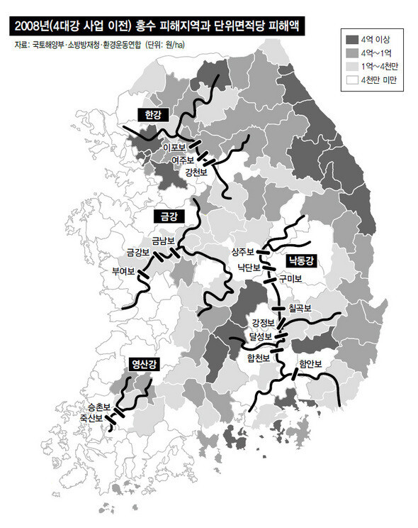 사실 4대강은 이전부터 정비를 해서 왠만한 집중호우로 인해 불어난 물도 어느정도 감당할 수 있도록 정비는 되었었습니다.. 여기에 이명박 정권은 보를 세우고 강 바닥을 준설한 것 뿐이죠.. 일부는 제방을 쌓기도 했지만..