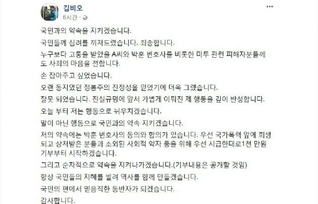 ◆오수정> 대표적인 예로 1억원 기부를 약속한 김비오 민주당 전 부산지역위원장의 사례가 있습니다. 지금은 청와대 행정관이고요. 김 행정관의 기부 약속은 지난 2018년 정봉주 전 의원의 미투 사건 때문이었는데요. "정봉주 전 의원의 결백에 1억원을 베팅하겠다"고 페이스북에 올린 게 발단이었습니다.