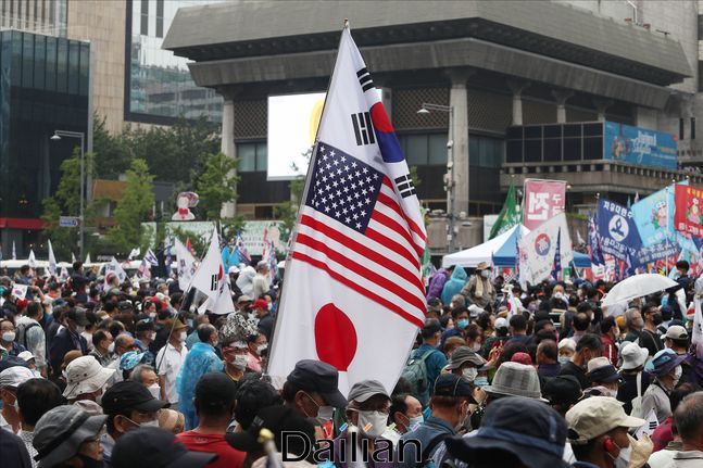 개신교발 코로나19 확진자가 폭증하고 있는 가운데 15일 오후 서울 광화문 세종대로 일대에서 열린 보수단체의 문재인 정부 규탄 대규모 집회에서 한 집회 참석자가 태극기와 성조기, 일장기를 들고 있다.