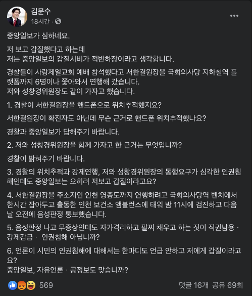 영상에는 김 전 지사가 경찰관들의 동행 요구를 거절하며 자신의 신분증을 보여주고 "나 김문수야"라고 수차례 말하는 장면이 등장한다. 이에 갑질논란이 일자 김 전 지사는 19일 페이스북에 "경찰이 서씨를 휴대폰으로 위치추적한 것과 자신에게 동행하자고 말한 것 등은 심각한 인권침해"라며 "음성판정 나고 무증상인데도 자가격리하고 팔찌 채우고 하는 짓이 직권남용·강제감금·인권침해 아니냐"고 썼다.