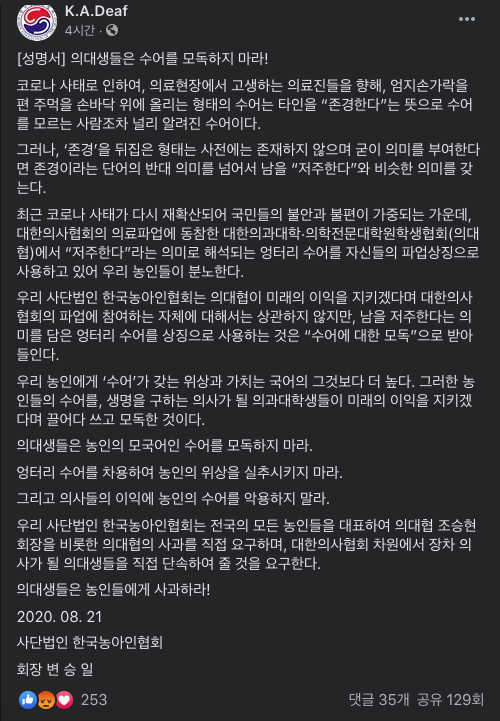 (한국 농아인협회측에선 해당 수화가 원래는 의미가 없지만 해석한다면 상대를 저주한다는 뜻을 의미한다고 합니다..)